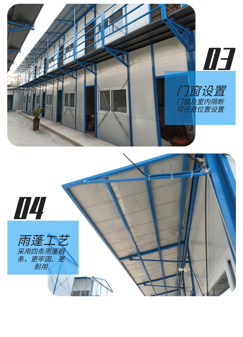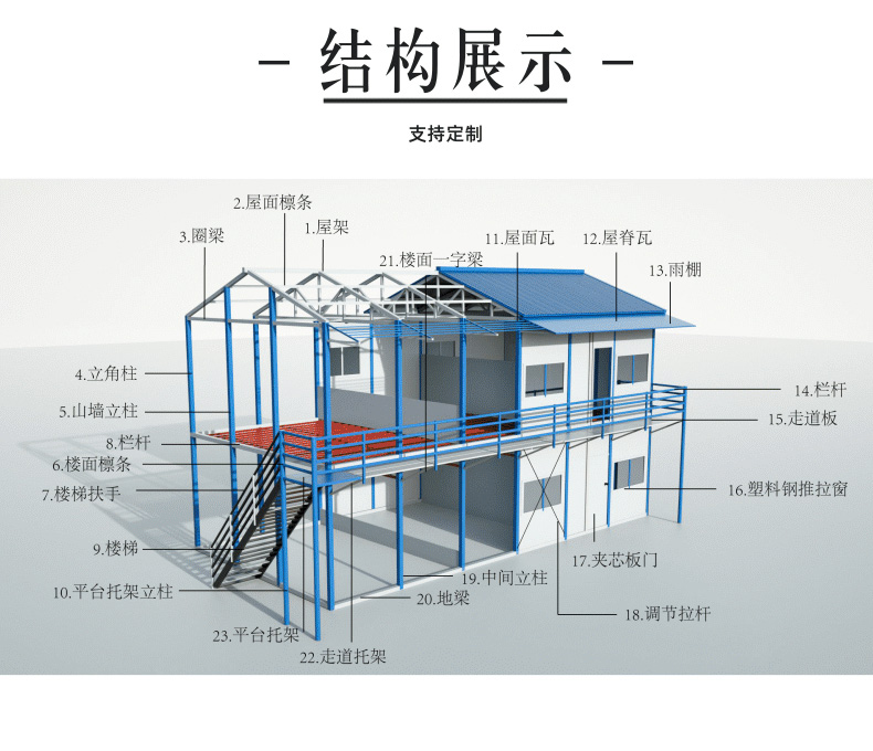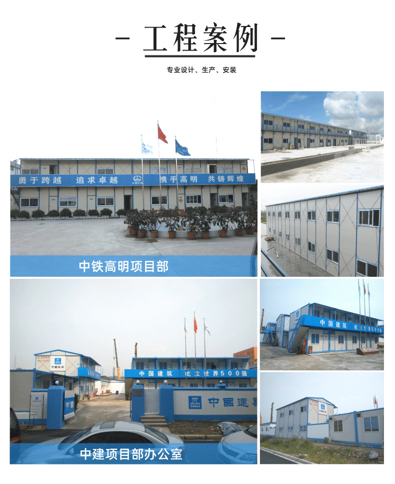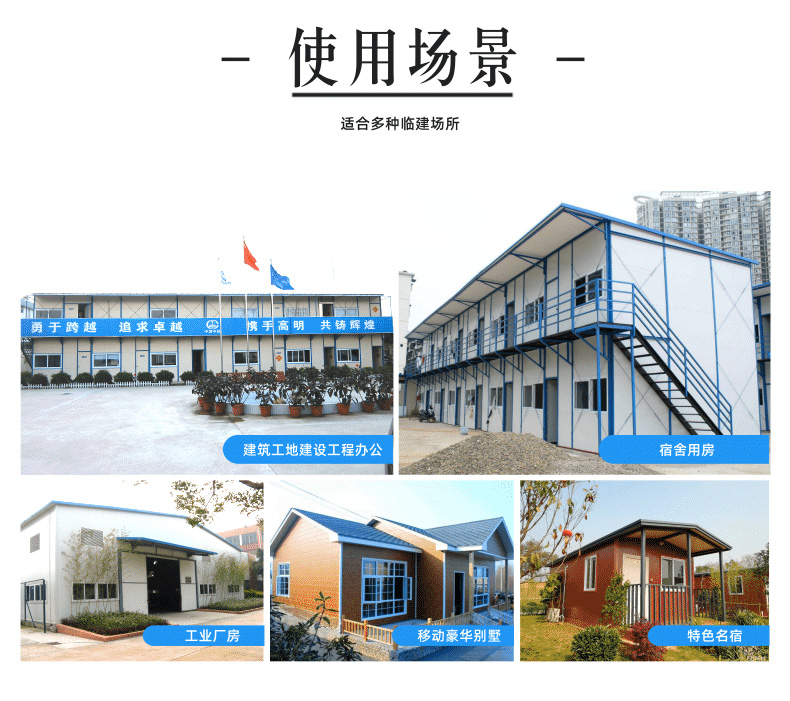 办公室,销售处,教室,商家,咖啡厅,展览厅,诊所,宿舍,饭堂,工厂,储藏室,停车场,简便的工作棚,单边坡房屋,活动室,活动别墅,现场临时设备等。