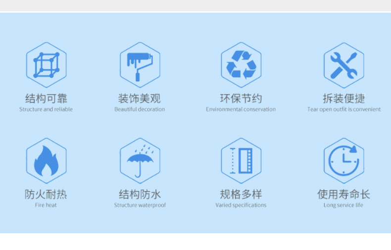 7,环保节能:房屋设计合理,拆装简便,可多次回收利用,损失率低,无建筑物浪费。年平均使用成本大大小于其他建材建造的同类房屋。